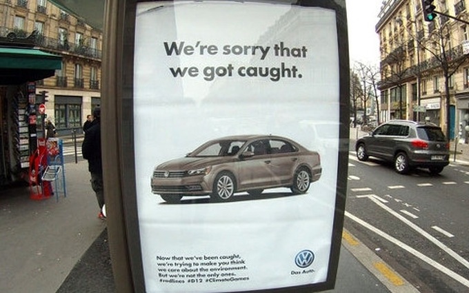 Một tấm poster công khai xin lỗi người tiêu dùng của VW sau khi hãng bị phát hiện gian dối về số liệu khí thải động cơ. Ảnh Reuters