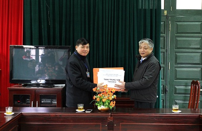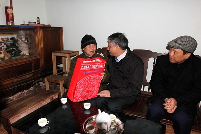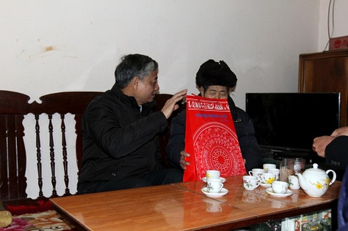 Thứ trưởng Doãn Mậu Diệp tới tặng quà cho ông Lường Văn Tăng, thương binh chống Pháp hạng 4/4 tại thôn Công Tum, xã Cao Kỳ
