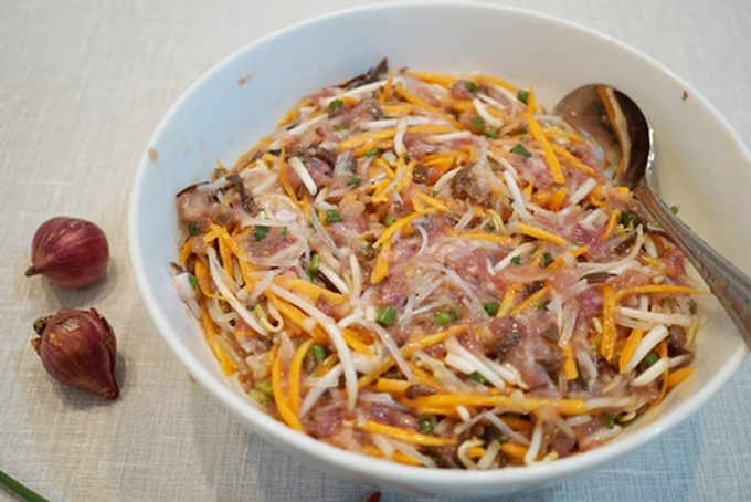 - Trộn nhân: Cho số lượng trứng vừa đủ để nhân không bị khô hoặc ướt quá. Nếu nhân khô, nem sẽ không ngon và có độ mềm cần thiết của nhân. Nếu nhân ướt quá, khi rán nem cũng dễ bị bục vỏ bên ngoài.