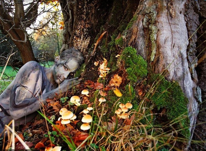 Jorg đã sử dụng màu xanh rêu và màu nâu để vẽ lên cơ thể người mẫu, người mẫu và thân cây như hòa làm một.
